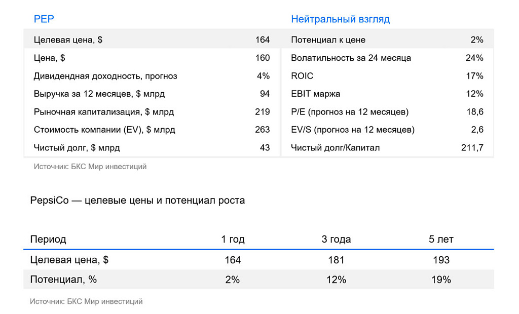 Текущий мультипликатор EV/EBITDA PepsiCo составляет 13,8х, на 12% ниже исторического медианного значения за последние 5 лет (115,7x). Мы ожидаем ограниченного роста котировок бумаги — повышаем целевую цену на 12 месяцев до $164 за акцию и сохраняем «Нейтральный» взгляд.