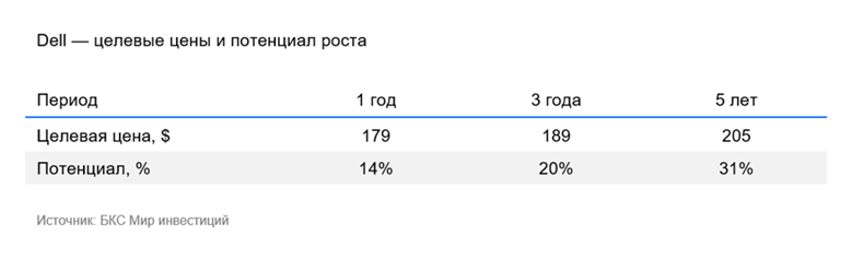 Наша оценка по методу дисконтирования денежных потоков и сравнительный анализ мультипликаторов с конкурентами также показывают, что акции Dell торгуются ниже справедливого уровня. Мы учитываем финансовые показатели, ведущие позиции на рынке и перспективы роста выручки от вложений в инфраструктуру ИИ.