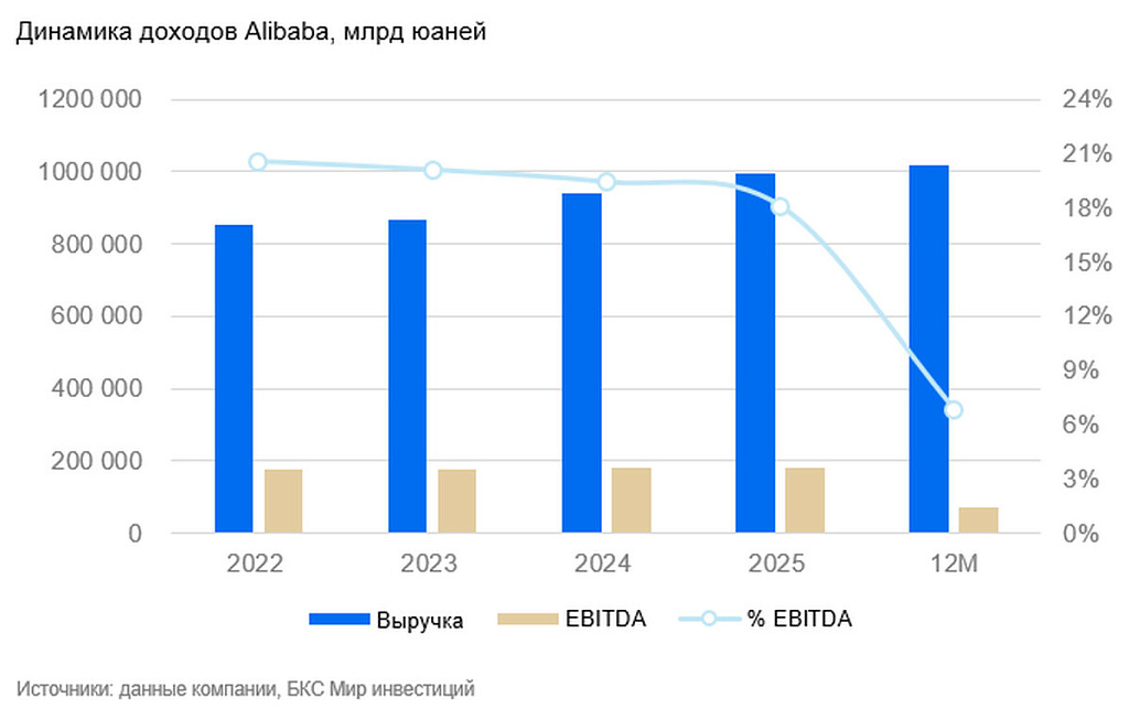 Рост инвестиций Alibaba в III квартале 2026 финансового года в подсегмент Quick Commerce существенно ускорился, что сильно снизило квартальную EBITDA всего сегмента электронного ритейла – на 43% по сравнению с годом ранее (c 60,4 до 34,6 млрд юаней). При этом выручка подсегмента выросла на 56%, до 20,8 с 13,4 млрд юаней в III квартале 2025 г., но инвесторы все равно восприняли отчетность негативно. После публикации котировки потеряли около 8%.