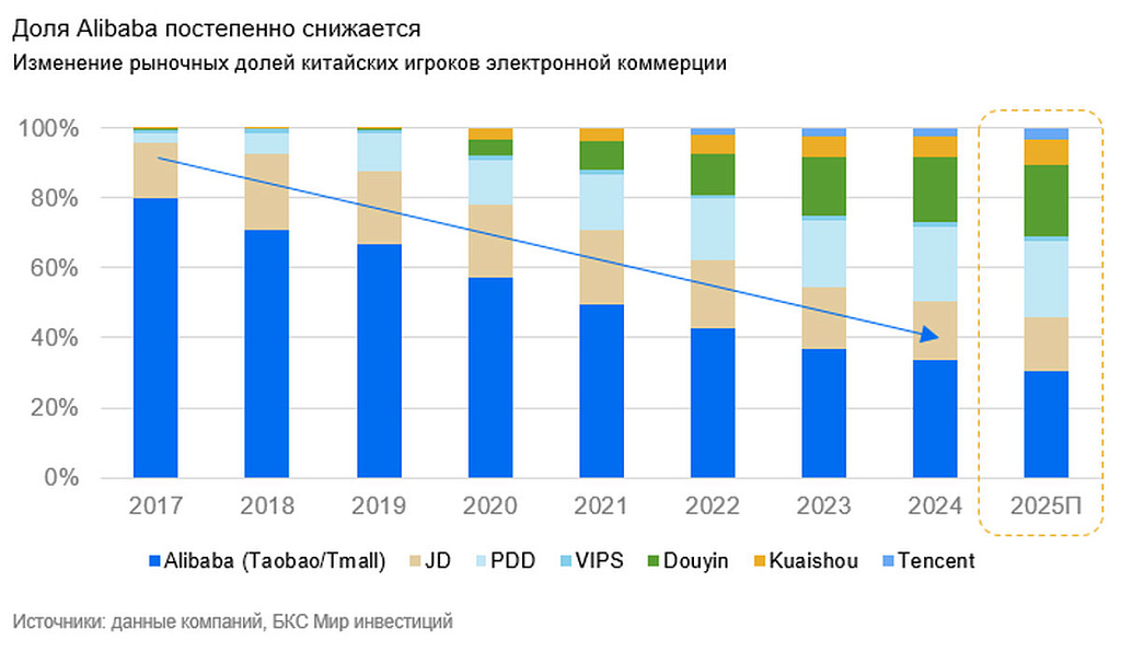 По состоянию на 2020 г. Taobao и Tmall Group (розничный сегмент Alibaba) занимал почти 60% внутреннего электронной коммерции (e-commerce) Китая. Ритейлер JD с 21% был на втором месте, Pinduoduo (PDD) с 13% — на третьем. Менее чем за 5 лет доля Alibaba сократилась до 35%, доля Pinduoduo (PDD) составила 21%, JD — 17%. Douyin, e-commerce платформа TikTok, нарастила рыночную долю до 19%, отразив новый тренд, когда не потребители ищут продукты, а стриминговые сервисы активно предлагают товары подписчикам.