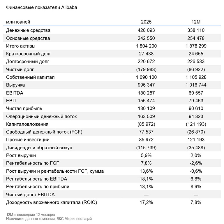 Несмотря на умеренный рост выручки и серьезное геополитическое давление, Alibaba сохраняет высокую маржинальность за счет операционной эффективности и масштаба. А поскольку капзатраты компании были ограничены, она с 2024 г. начала платить дивиденды. Также Alibaba с середины 2022 г. выкупила с рынка 10% своих акций. В итоге за 2024 г. компания вернула акционерам порядка $30 млрд. Учитывая невысокую оценку бумаги в 2024 г., мы считаем такую аллокацию капитала эффективной и в интересах миноритариев. Но у группы есть потребность в стратегических инвестициях в облачный сегмент и сверхбыструю доставку, поэтому вероятность активного выкупа акций с рынка даже при снижении котировок невысока, хотя компания пока сохраняет дивидендные выплаты.