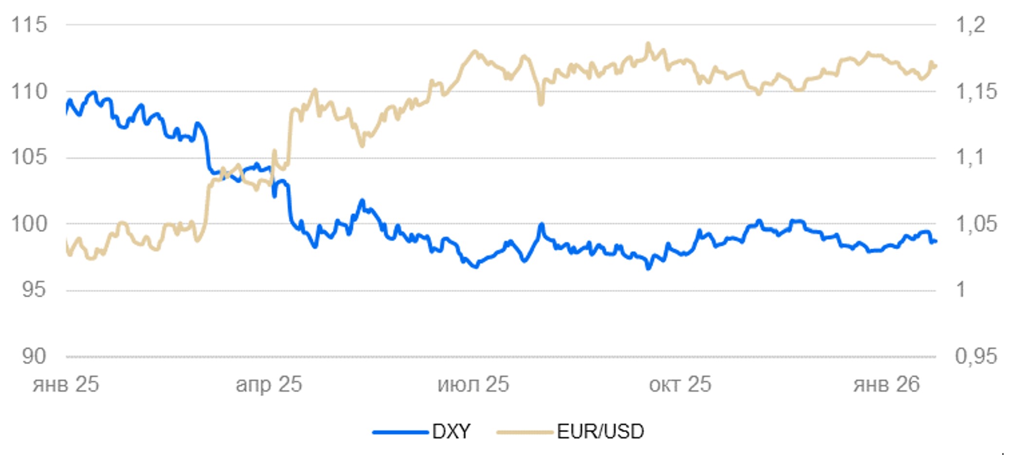 Обмен агрессивными заявлениями представителей ЕС и США спровоцировал распродажу доллара — индекс DXY за неделю снизился на 0,6% до 98,7. Если на прошлой неделе европейские валюты практически игнорировали комментарии Дональда Трампа по поводу Гренландии, то на этой неделе, после выступления американского лидера в Давосе, рынки начали активно продавать доллар и покупать евро. Цены драгоценных металлов на бирже продолжили расти.