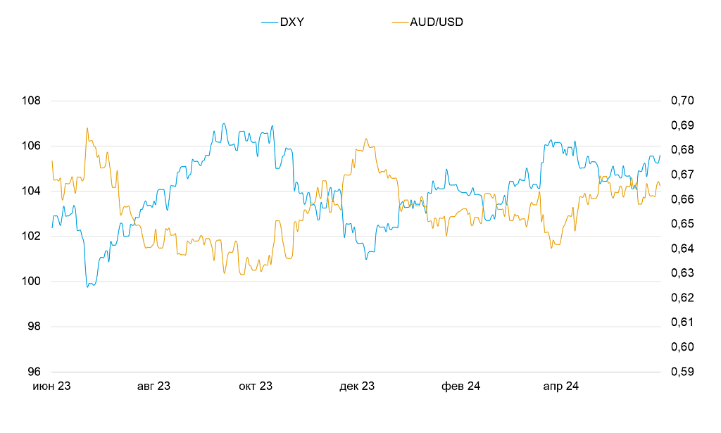 Динамика индекса DXY и пары AUD/USD