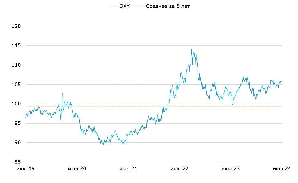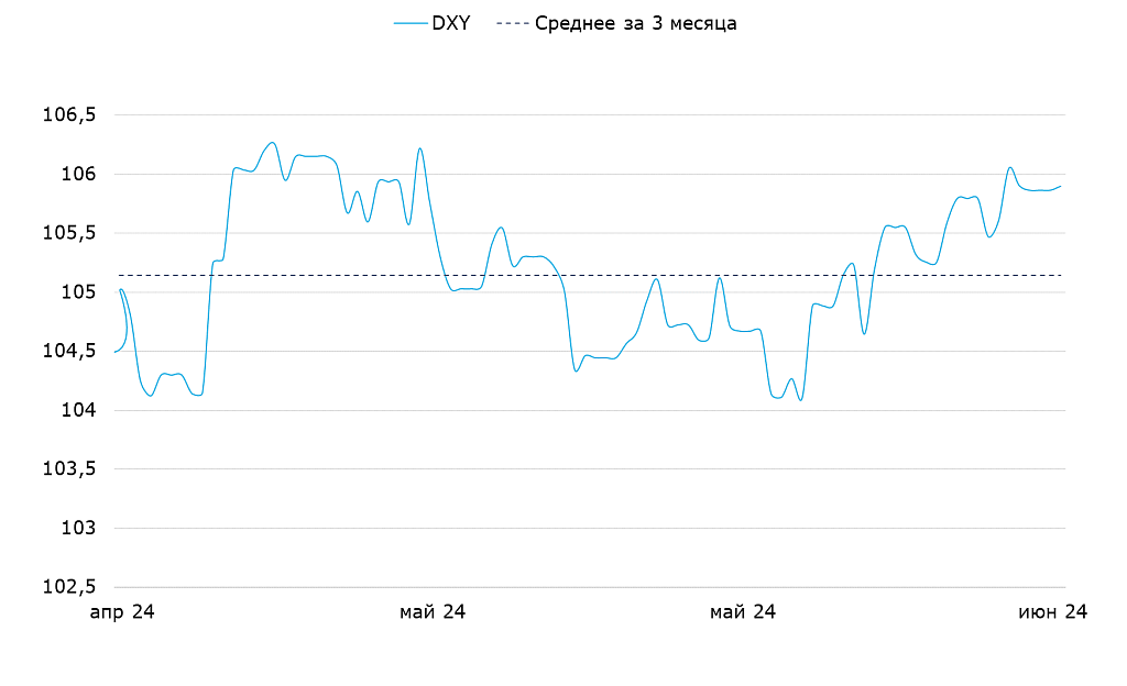 Курс доллара на прошлой неделе минимально укрепился до уровня 105.9 по индексу DXY. Макростатистика в основном говорила в пользу более слабого доллара, но в дело вмешался политический фактор. Слабое выступление президента Байдена на дебатах с Трампом увеличило поддержку последнего. Республиканцы в США традиционно придерживаются более жесткой бюджетной политики, поэтому возможная победа Трампа на выборах осенью – фактор укрепления доллара. Однако мы ждем коррекции курса на этой неделе до 105.5 DXY на фоне выхода новой статистики, в первую очередь майской статистики по рынку труда.