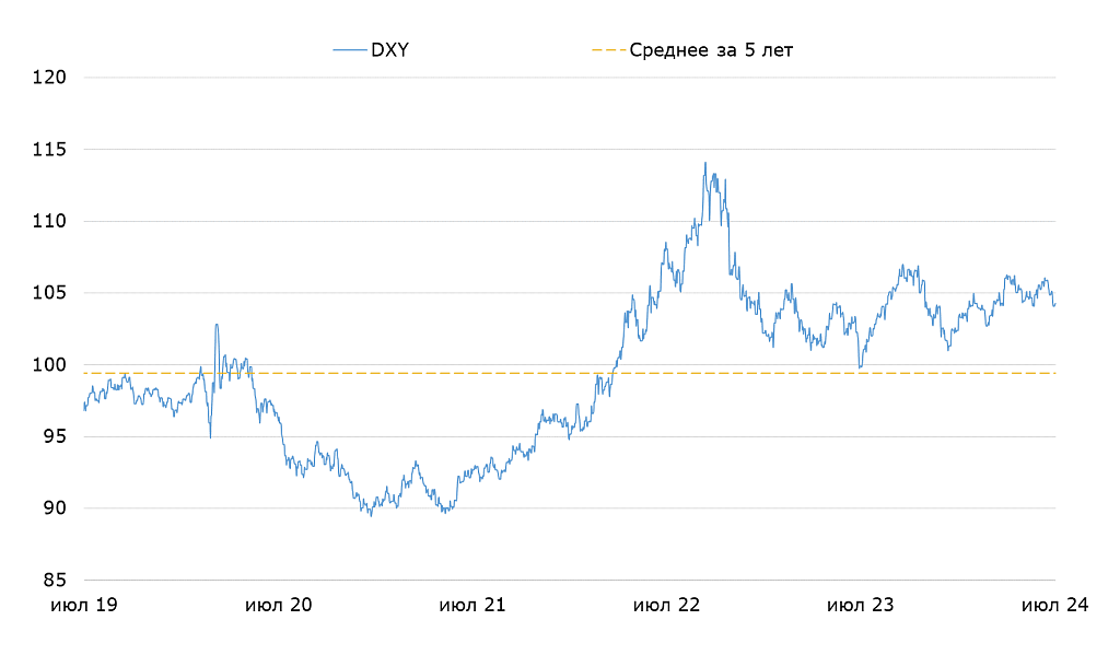Доллар продолжил слабеть на прошлой неделе: курс опустился до уровня 104.3 DXY, в соответствии с нашим прогнозом. Триггером снижения стало замедление инфляции в июне. На этой неделе выходят данные по розничным продажам и промышленному выпуску в июне. Мы не ожидаем, что они сильно повлияют на курс — доллар на короткое время стабилизируется вблизи текущих уровней.