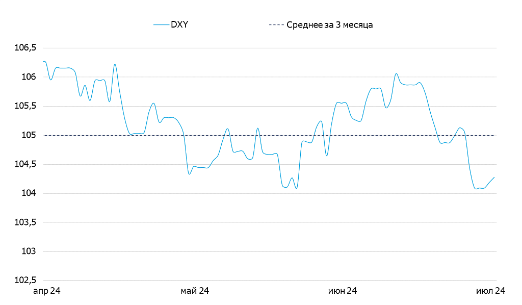 Курс доллара был стабильным на прошлой неделе и оставался в диапазоне 104 DXY в соответствии с нашим прогнозом. Розничные продажи оказались заметно лучше прогнозов: объемы не изменились по сравнению с маем. Аналитики ожидали замедление на 0.3%. Объем промышленного производства оказался вдвое выше ожиданий (+0.6% м/м).
