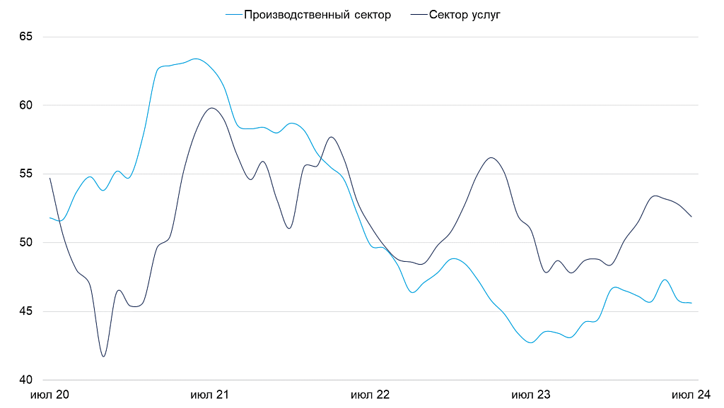 В среду, 24 июля, вышли предварительные данные по индексам деловой активности. Все показатели продемонстрировали снижение сильнее ожидаемых уровней. Индекс деловой активности в сфере услуг составил 51.9 против 52.8 в прошлом месяце, в производственном секторе — 45.6 против 45.8 в июне. В отчете отмечается, что компании прекратили набор персонала, а количество новых заказов сокращается второй месяц подряд.