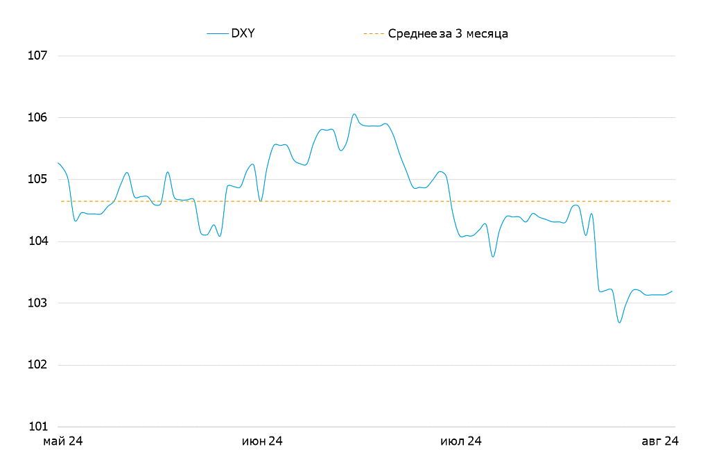 Курс доллара на прошедшей неделе укрепился до 103.2 DXY, вопреки нашим ожиданиям. Укрепление пришлось на 8 августа и было спровоцировано реакцией рынка на небольшое снижение числа новых заявок на пособие по безработице. На этой неделе выйдут данные по инфляции и розничным продажам в июле. Мы ожидаем продолжения охлаждения экономики США в июле и коррекцию курса доллара ниже 103 DXY. Однако возможно резкое укрепление до уровня 103.5 DXY в случае ускорения инфляции в июле.
