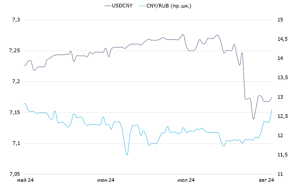 Юань на прошлой неделе минимально ослаб к доллару до уровня CNY 7.16/$ на фоне укрепления американской валюты. Позитивным сигналом для рынка стало ускорение инфляции в Китае в июле, что уменьшает вероятность дальнейшего снижения ставки в Китае в ближайшем будущем. На этой неделе выйдут данные по промпроизводству и безработице в июле, но валютный рынок обычно слабо реагирует на эту статистику, поэтому мы прогнозируем сохранение курса юаня вблизи текущих отметок.