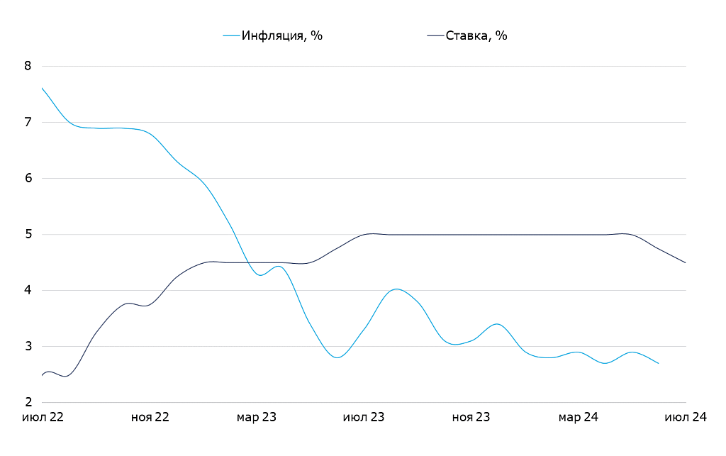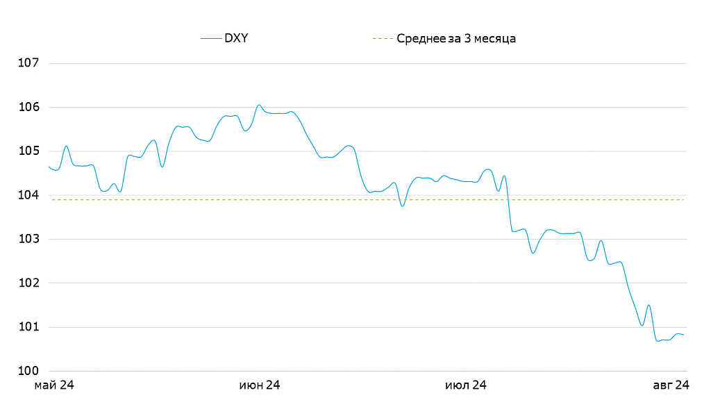Протокол июльского заседания ФРС показал, что заметная часть участников хотели снизить ключевую ставку уже в июле. На этом фоне рынок ожидает, что в сентябре регулятор снизит ставку сразу на 50 б.п. — чтобы компенсировать паузу в июле. Пауэлл, выступая в Джексон-Хоул, по сути, анонсировал снижение ставки в сентябре, однако на сколько — четких сигналов не последовало. Скорее всего, определяющим фактором станут данные рынка труда, которые выйдут в начале сентября.