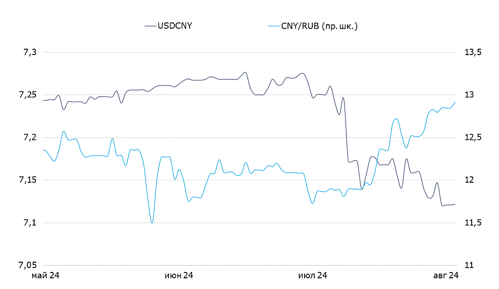 На этой неделе выйдут данные по производству в основных отраслях, динамике ВВП, розничного товарооборота и безработицы в июле, но значительного влияния на курс мы не ожидаем. Мы по-прежнему прогнозируем гармонизацию курсов рубля и закладываем укрепление юаня на этой неделе. В то же время курс рубля к доллару на внутреннем рынке уже достиг паритета с курсом на внешнем рынке — ослабление к доллару прекратится.