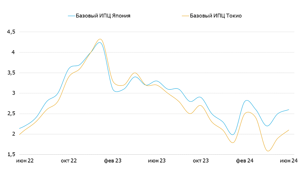 Динамика базовой инфляции в Японии и Токио, %, г/г
