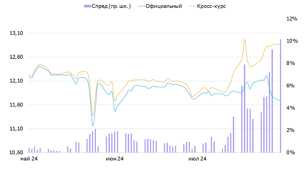 Официальный курс доллара в РФ за неделю вырос до RUB 91.8/$, в то время как биржевой курс юаня обвалился до RUB 11.7/CNY. Разница между кросс-курсом юаня, рассчитанным через официальный курс доллара, и официальным курсом юаня превысила 10%. Курс обвалился из-за того, что экспортеры нарастили продажу валюты на бирже.