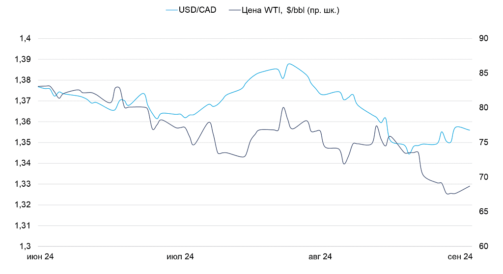 «Луни» на прошлой неделе ослаб до CAD 1.358/$ на фоне снижения ключевой ставки. Дополнительное давление оказала слабая статистика с рынка труда. Теперь ждем данные по инфляции в августе. Также мы полагаем, что давление на канадский доллар усилится со стороны дешевеющей нефти.