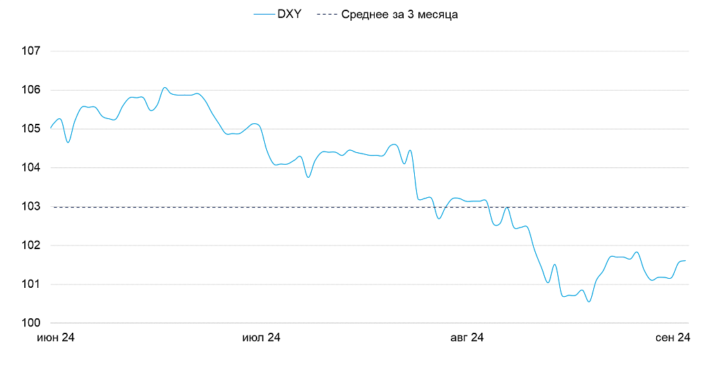 Курс доллара практически не изменился на прошлой неделе и минимально опустился до 101.6 DXY. Сначала американская валюта снижалась из-за слабого промышленного индекса PMI, но к концу недели укрепилась на фоне хороших данных по PMI в сфере услуг. На этой неделе ожидаем повышенной и труднопредсказуемой волатильности доллара — во вторник пройдут дебаты кандидатов в президенты США от Демократической и Республиканской партий Камалы Харрис и Дональда Трампа.