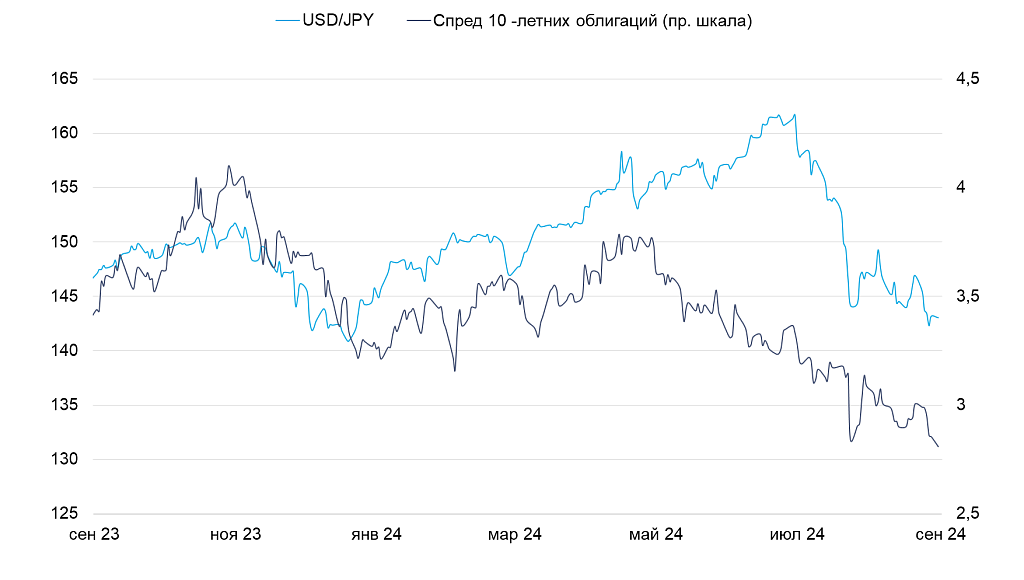 Расходы домохозяйств в июле снизились на 1.7% м/м, годовые темпы роста замедлились до 0.1% г/г. На наш взгляд, это сводит почти к нулю вероятность повышения ключевой ставки в сентябре. Рост ВВП во 2К24 оказался незначительно хуже ожиданий (2.9% г/г), что тоже аргумент против ужесточения монетарной политики. На наш взгляд, Банк Японии теперь пойдет на повышение ставки не раньше декабря.