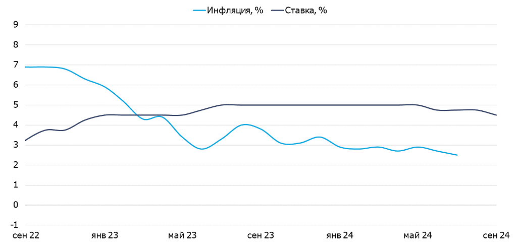 Мы ожидаем снижения ставки ФРС на 25 б.п. в эту среду и мягкого сигнала по дальнейшим снижениям. Отмечаем, что вероятность снижения на 50 б.п. также очень высокая. Однако факт стабилизации годовой инфляции на уровне 2.5% в августе (выше ожиданий рынка), а также ускорение индекса потребительских цен в августе до 0.3% к прошлому месяцу (также выше ожиданий) должны склонить ФРС к более жесткому решению.