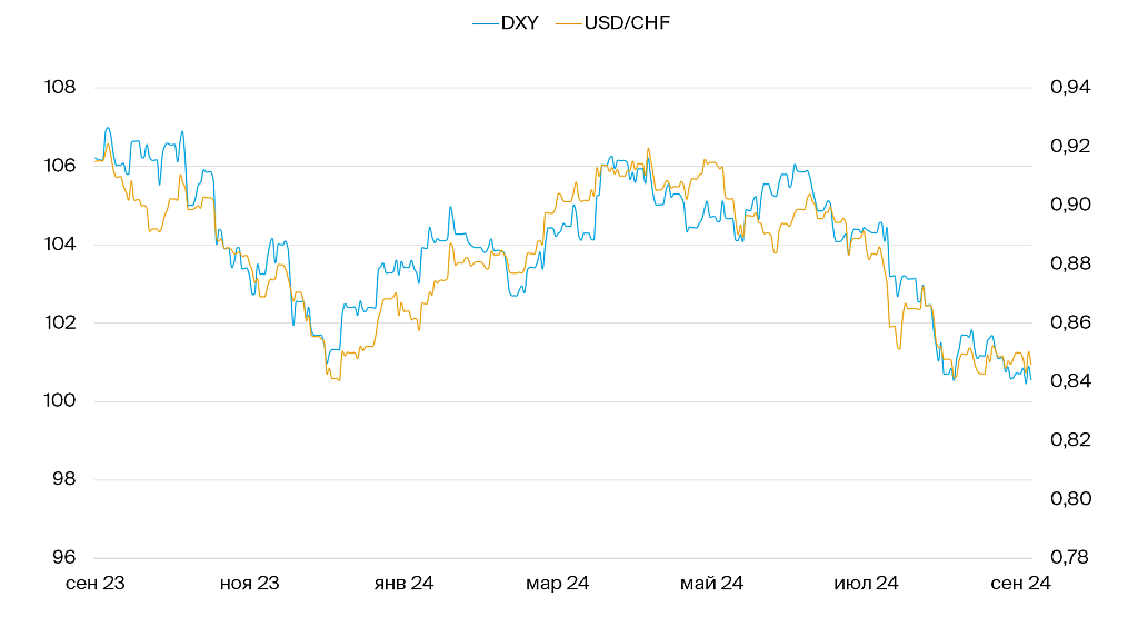 Евро за прошедшую неделю ослаб всего на 0.2%, дублируя динамику индекса DXY. Сужение ценового диапазона в ближайшее время вполне может обернуться резкими движениями. Направление будет зависеть, вероятно, от предварительных данных по инфляции за сентябрь, которые будут опубликованы 1 октября. Мы ожидаем, что в случае совпадения факта с консенсус-прогнозом по ИПЦ евро будет торговаться в диапазоне USD 1.105-1.11.
