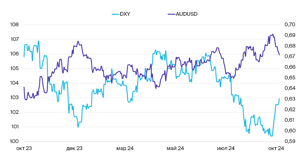 Новозеландский доллар за эту неделю стал главным аутсайдером. Валюта потеряла сразу 3% после решения Резервного банка Новой Зеландии снизить процентную ставку на 50 б.п. При этом данные по инфляции за третий квартал еще не вышли, что говорит о серьезной уверенности регулятора, что рост цен замедляется. Теперь рынок ждет подтверждения такому решению 16 октября. Если фактический уровень инфляции окажется значительно выше прогноза, то мы считаем, что новозеландский доллар резко укрепится до диапазона $0.61–0.615. В базовом сценарии «киви» перейдет в боковик и завершит следующую неделю в коридоре $0.605–0.61