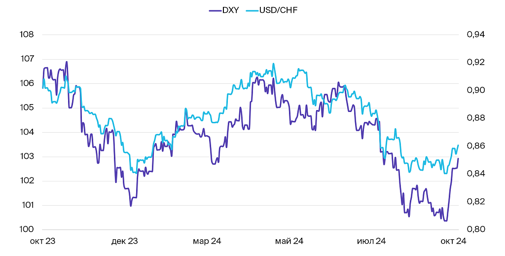 Швейцарский франк за неделю потерял более 1.2%, следуя за индексом DXY. Важных макроэкономических новостей до следующего обзора мы не ожидаем. Франк, вероятно, продолжит зеркалить DXY. Однако не стоит забывать, что Национальный банк Швейцарии при необходимости готов проводить интервенции как в сторону покупки, так и продажи валюты. Мы считаем, что к концу недели франк будет торговаться в диапазоне 0.86 – 0.865 за доллар США.