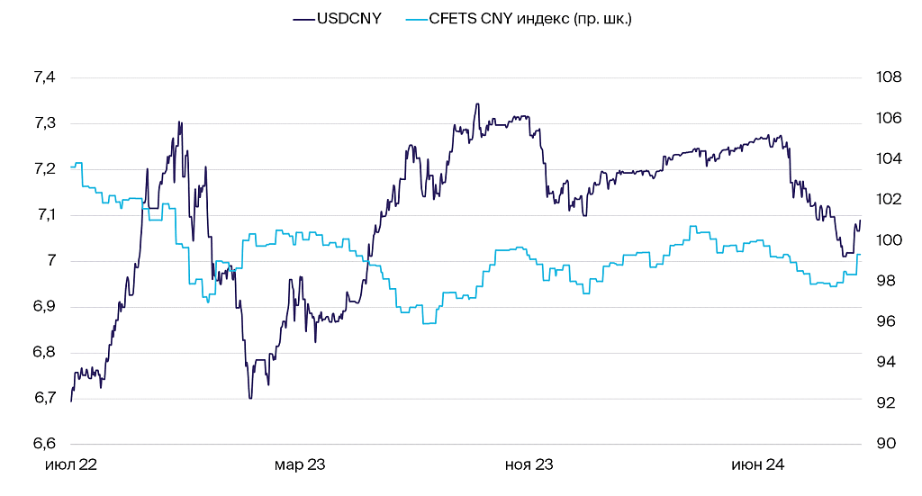 Динамика курса юаня к доллару и корзине валют