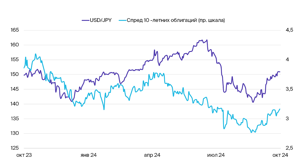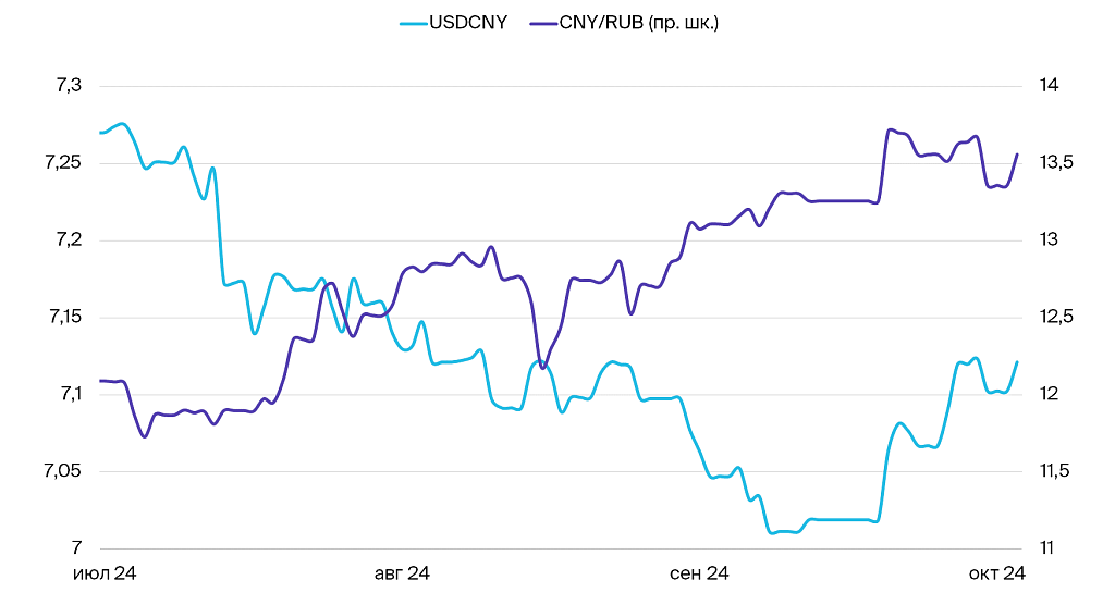 Иена на прошлой неделе ослабла до JPY 151/$ на фоне укрепления доллара США. Кроме этого на иену также давят внутренние политические факторы. Правящая партия теряет поддержку перед выборами, и инвесторы опасаются, что новое правительство может отказаться повышать ключевую ставку. Мы допускаем, что на этой неделе курс продолжит слабеть до 152–153 иен за доллар США. В случае более крутого пике власти могут поддержать курс с помощью валютных интервенций.
