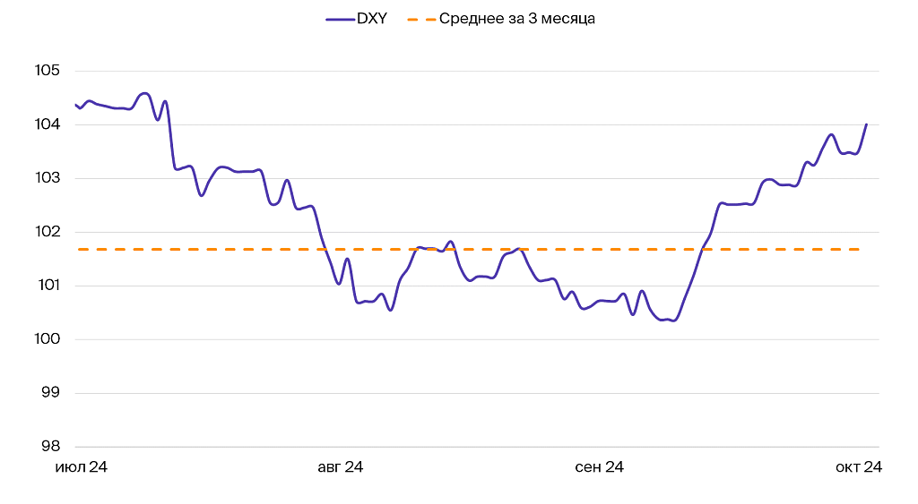 Ралли доллара продолжилось на прошлой неделе. Индекс DXY вырос до 103.9 на хороших данных по розничному товарообороту в сентябре. Но главная причина ралли сейчас — президентские выборы в США, где растут шансы на победу Дональда Трампа. На наш взгляд, доллар приближается к пику укрепления. Мы ожидаем, что на этой неделе американская валюта стабилизируется на текущем уровне.