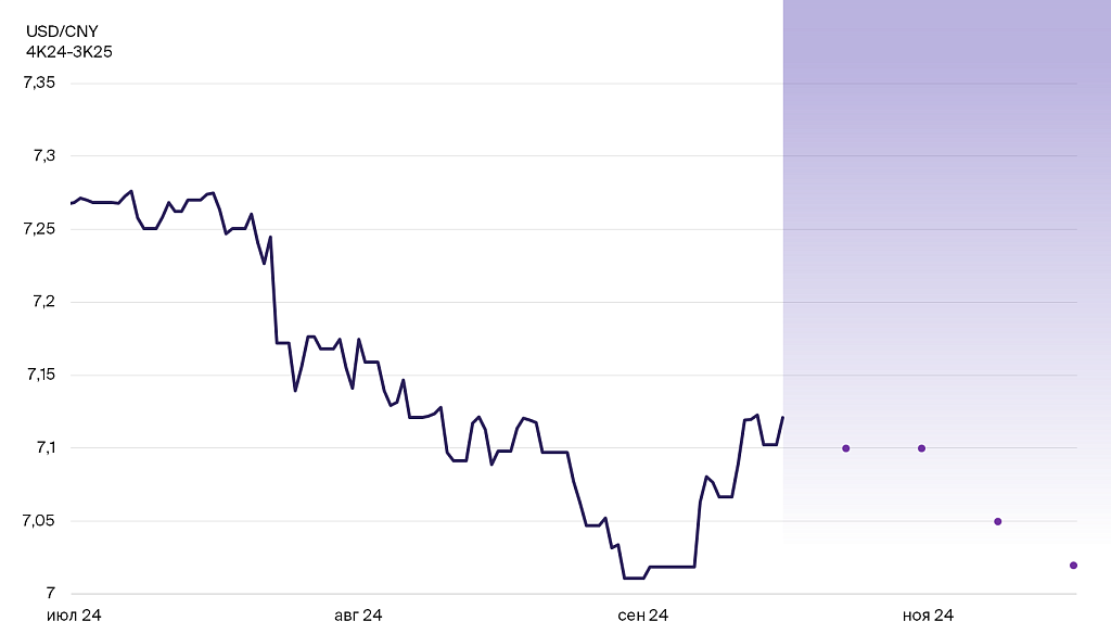 В 3К24 юань укрепился на 34% к доллару США на фоне начала снижения ставок ФРС. Укрепление оказалось сильнее нашего прогноза: мы ожидали более активного снижения ставок в Китае, которое обеспечило бы сохранение паритета курсов.