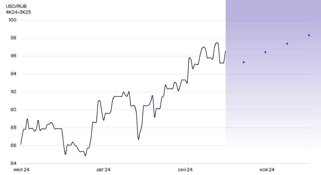 В конце сентября – начале октября рубль резко ослаб, хотя экспортеры традиционно увеличили продажи валюты в конце месяца, чтобы заплатить налоги. На рубль давит снижение нормативов обязательной продажи валюты. Другой негативный фактор — меньше продает валюты и правительство, поскольку упали дополнительные нефтегазовые доходы. По нашей оценке, рубль вряд ли продолжит так же быстро терять позиции и даже укрепится по итогам квартала. Однако в 2025 г. ослабление рубля возобновится.
