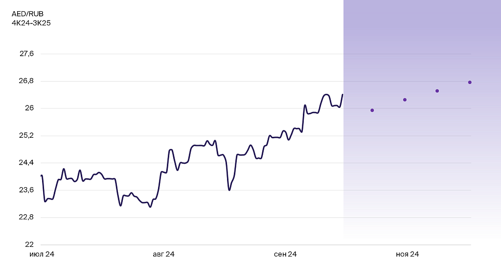- Долгосрочный взгляд на 12 месяцев — позитивный на дирхам ОАЭ против рубля с целевым курсом AED/RUB 26,77.