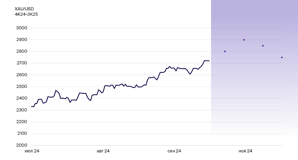 В последний год цену золота разгоняли геополитическая нестабильность, спрос центральных банков, а также смягчение денежно-кредитной политики в разных странах. Эти факторы не потеряют актуальности и в ближайшие 12 месяцев. Пиковых цен на золото стоит ожидать в I квартале 2025 г., а дальше цена стабилизируется и будет плавно снижаться.