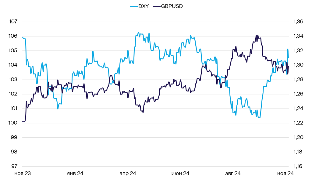 Индекс доллара США DXY после выборов в США перешел к резкому ралли, за один день прибавив 1.6%. Однако в четверг произошла коррекция, которая срезала часть роста и позволила другим валютам немного отыграть свои позиции.