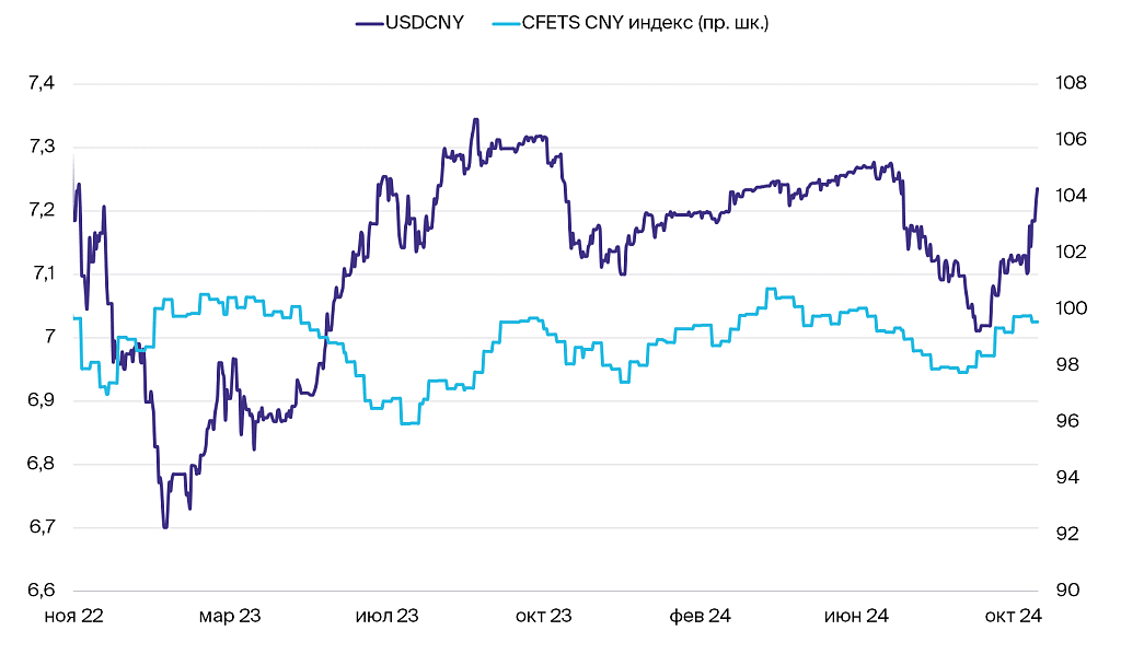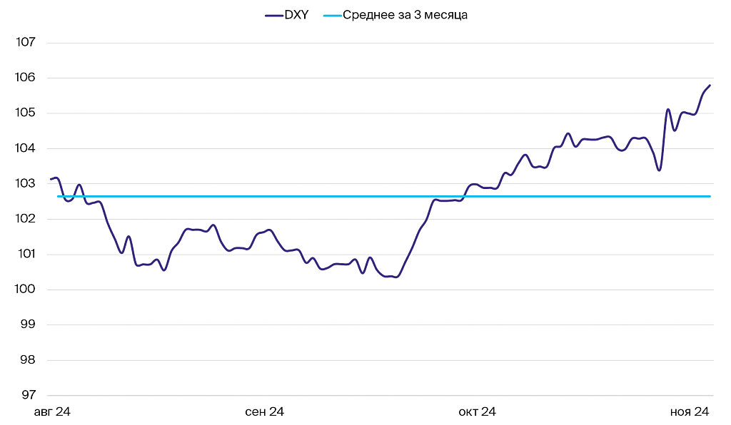 После победы Дональда Трампа на выборах и заявлений о планах укрепить экономику индекс доллара DXY продолжил расти. Фундаментальные факторы не изменились, и мы ожидаем, что в ближайшее время американская валюта скорректируется. Причиной станет статистика, особенно по занятости и платежному балансу. Рубль немного укрепился, а юань слегка ослаб на фоне слабых макроэкономических данных и риторики Трампа.