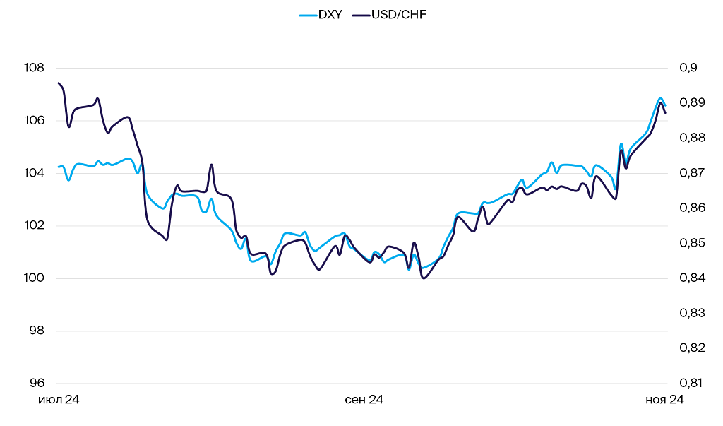За прошедшую неделю американский доллар прибавил более 2%. Причина по-прежнему в победе республиканцев на выборах в США, чья политика исторически считается проинфляционной. На этот раз ни одна валюта не смогла противостоять давлению доллара.