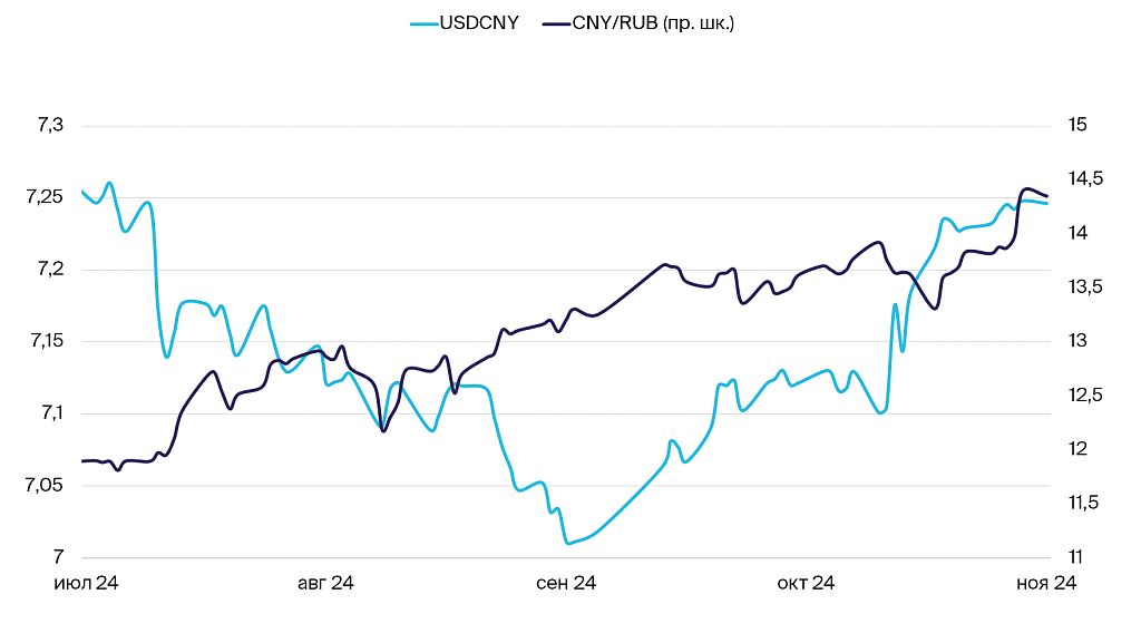 На фоне заявлений о пошлинах снижение юаня выглядит косметическим. Курс валюты Поднебесной остается в диапазоне 7,23–7,25 юаней за доллар США. Народный банк Китая старается удержать курс от падения после итогов выборов в США. 20 ноября регулятор сохранил базовую процентную ставку на уровне 3,1%. Ставка по 5–летним кредитам также не изменилась — 3,6%. Решение НБК соответствует ожиданиям рынка. Обе ставки находятся на рекордных минимумах