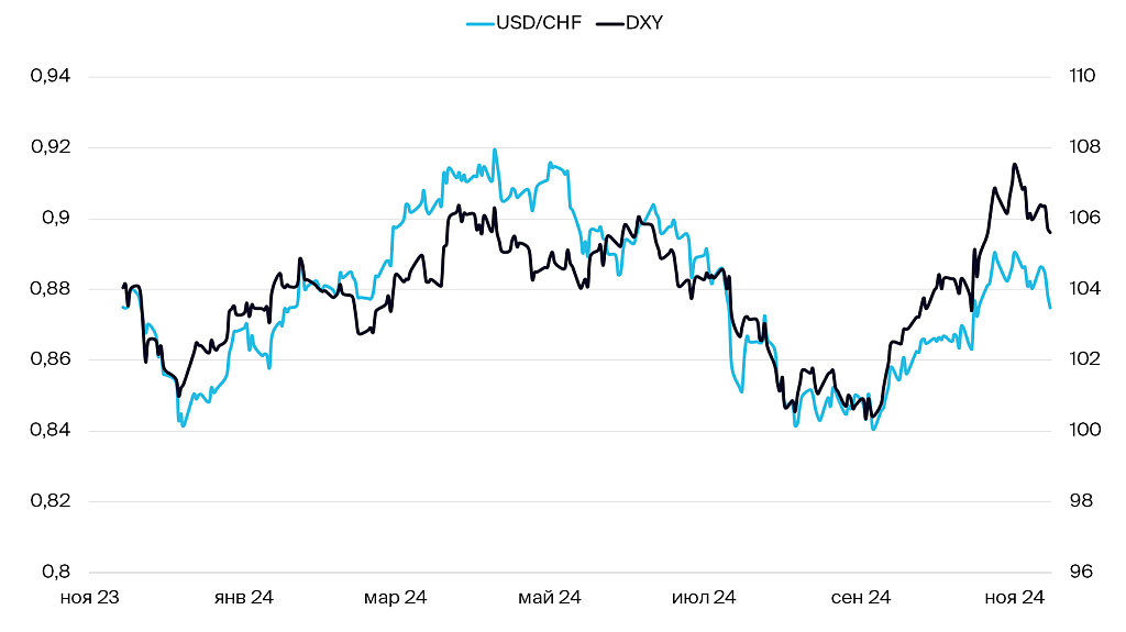 Уже на следующей неделе пройдет заседание Национального банка Швейцарии (НБШ) по процентным ставкам — последнее в 2024 г. Рынок ожидает очередного снижения на 25 б.п. до 0.75%. Мы считаем, что волатильность вырастет в любом случае, поскольку заседания НБШ проходят только один раз в квартал, и рынок внимательно следит за риторикой регулятора. Если фактическое положение дел будет соответствовать ожиданиям рынка, мы считаем, что к пятнице франк будет торговаться в диапазоне CHF 0.87-0.872.