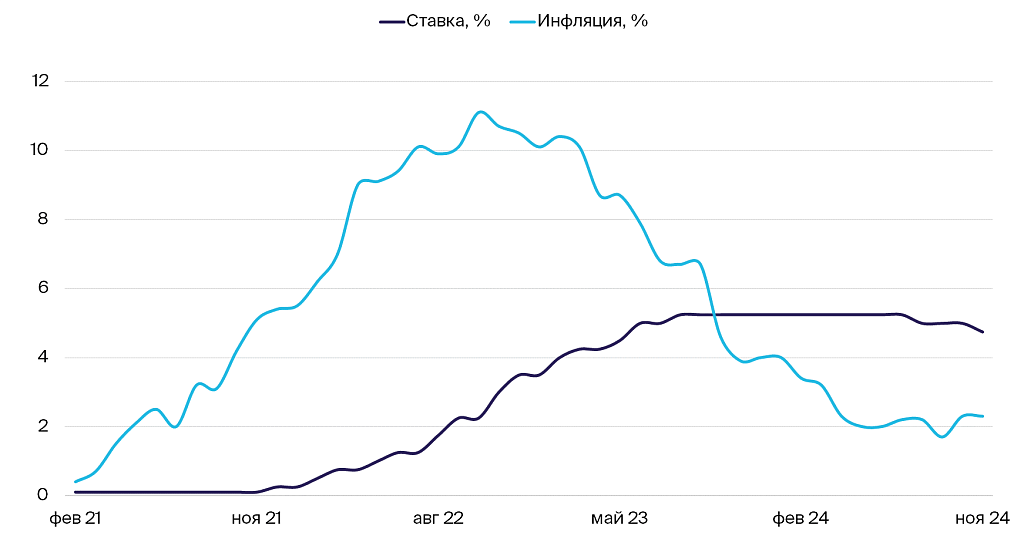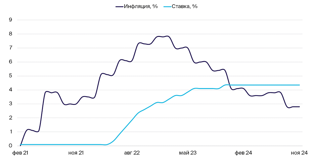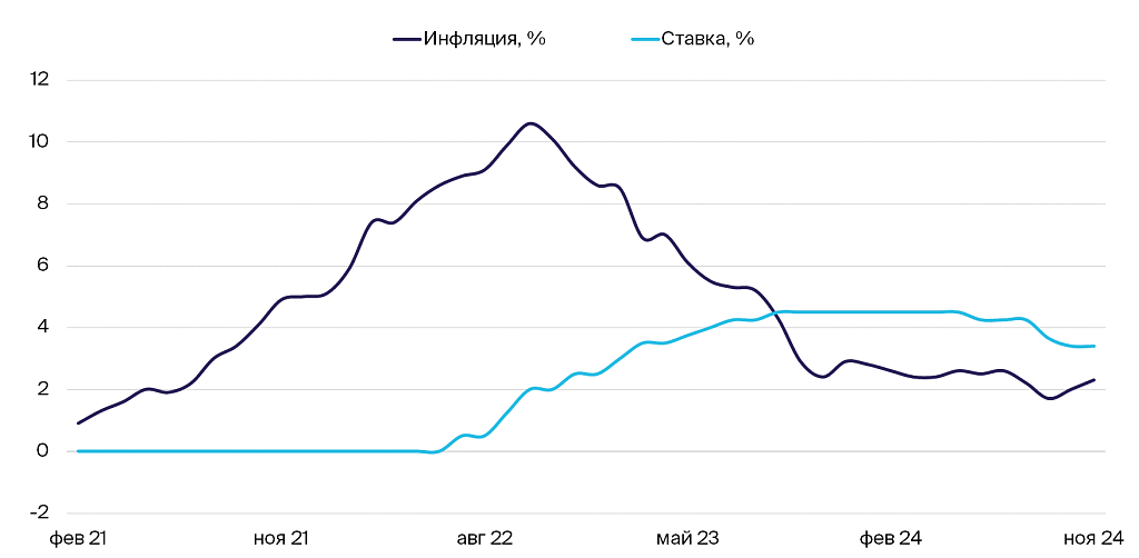 В четверг Европейский центральный банк (ЕЦБ) принял решение снизить процентную ставку на 25 базисных пунктов до 3,15%, что и ожидалось рынком. ЕЦБ смягчил свой «ястребиный» настрой и предупредил, что экономический рост будет слабее, чем прогнозировалось ранее. Это уже четвертое снижение в еврозоне за 2024 г. Кроме того, глава регулятора отметила, что угрозы Трампа ввести всеобъемлющие пошлины в размере до 20% на весь импорт США и их влияние на рост «не входят в базовый прогноз». Если этот сценарий реализуется, есть риски более агрессивного смягчения денежно-кредитной политики ЕЦБ.