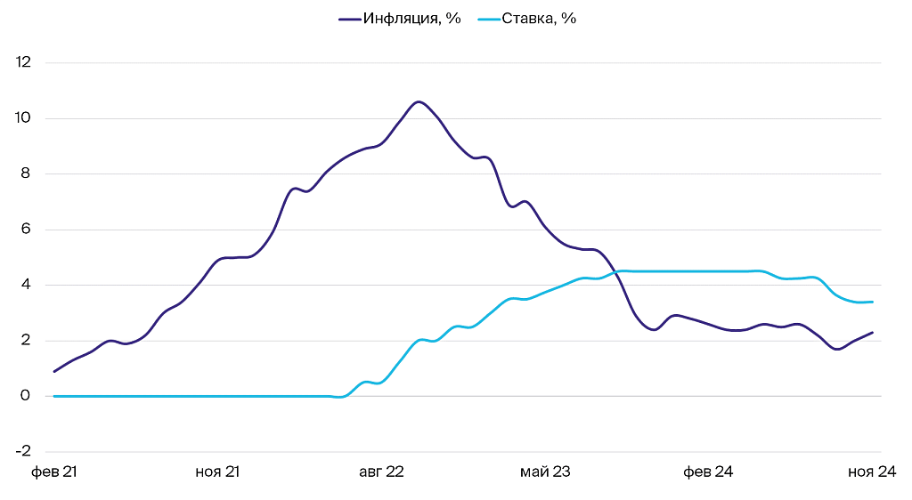 Банк Англии в четверг сохранил ставку на уровне 4,75%, что соответствует ожиданиям рынка. Однако при голосовании регулятора голоса разделились 6/3. После такого умеренно мягкого сигнала рынок изменил ожидания по дальнейшей динамике денежно-кредитной политики. При этом комитет по ДКП не дает прогнозов по срокам и масштабу снижения ставки в 2025 г.
