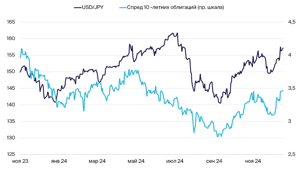 Разница в доходности гособлигаций Японии и США и курс иены
