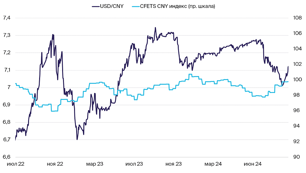 Динамика курса юаня к доллару CША и корзине валют