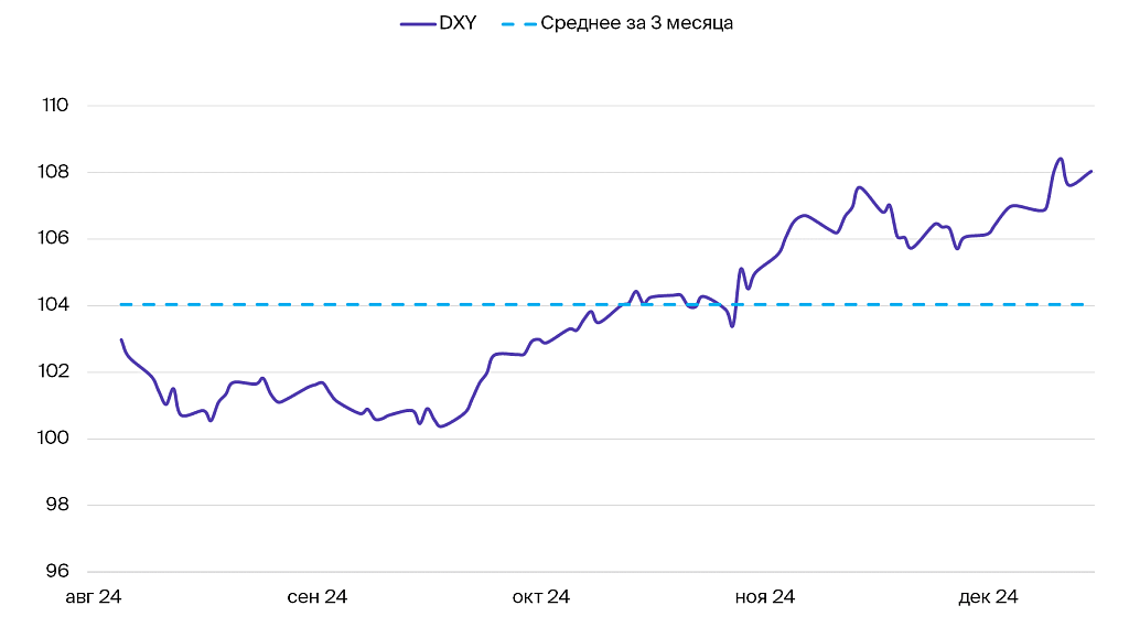 Доллар остается на максимумах после комментариев Джерома Пауэлла. Глава ФРС заявил, что темпы снижения ставки замедляются. Индекс доллара DXY всю неделю был выше 108. Как минимум до прихода Дональда Трампа в Овальный офис и смены главы ФРС ожидания по ставке не изменятся, и доллар будет относительно дорогой. Вместе с тем общие потребительские настроения в США резко просели. Индекс доверия потребителей в США в ноябре упал до 104,7 против 112,8 месяцем ранее. У населения растет пессимизм по поводу перспектив занятости. Пока же число лиц, получающих пособие по безработице, и количество заявлений на его получение остается ниже ожиданий рынка.