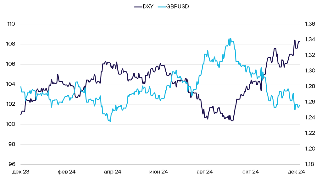 Динамика индекса доллара DXY и валютной пары GBP/USD
