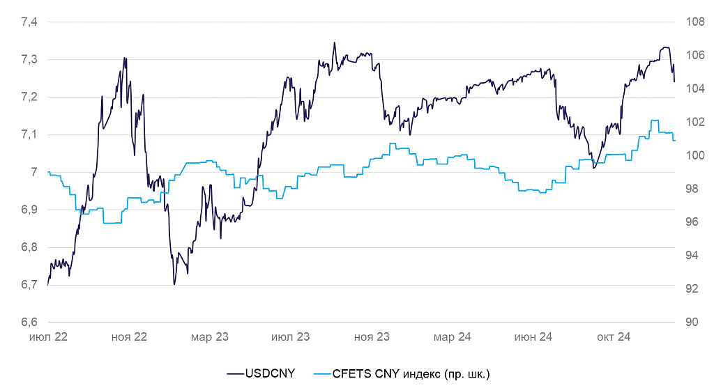Динамика курса юаня к доллару CША и корзине валют