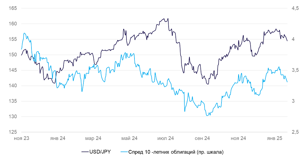 Разница в доходности гособлигаций Японии и США и курс иены