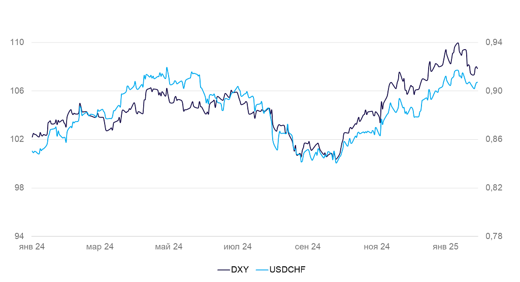 Динамика индекса доллара DXY и валютной пары USD/CHF