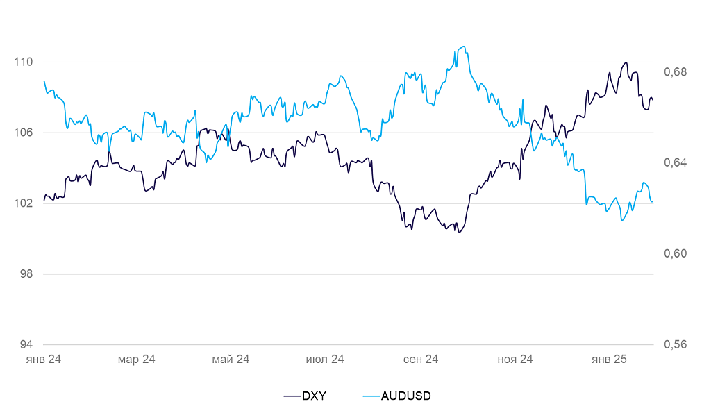 Динамика индекса доллара DXY и валютной пары AUD/USD
