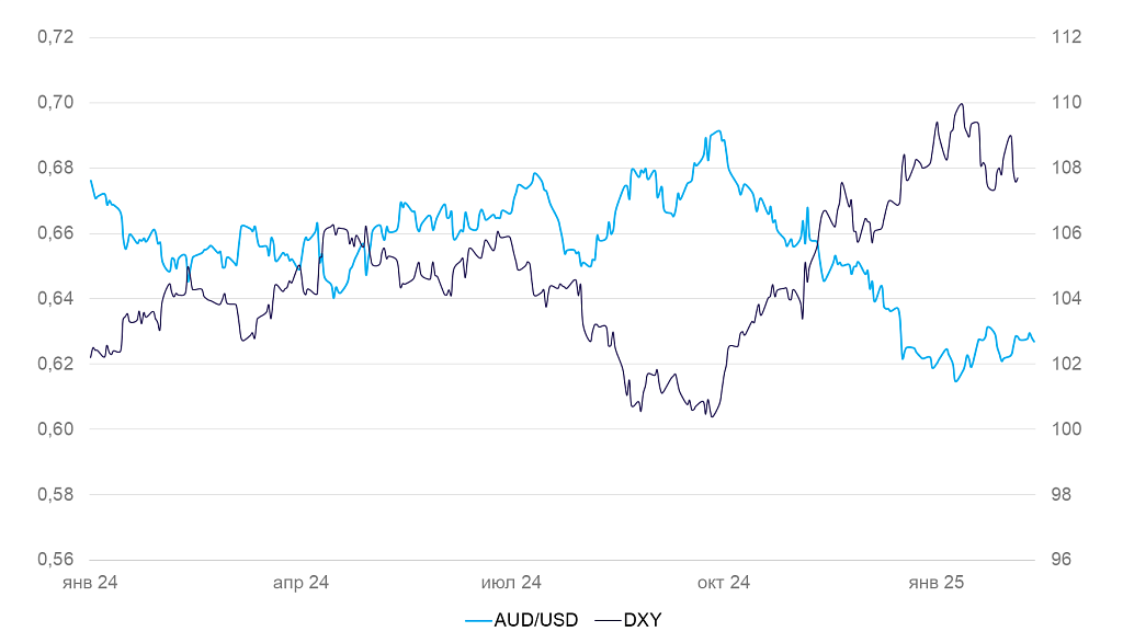 Динамика индекса доллара DXY и валютной пары AUD/USD