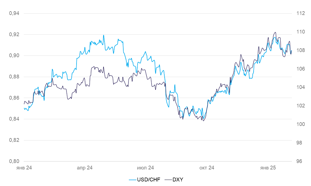 Динамика индекса доллара DXY и валютной пары USD/CHF