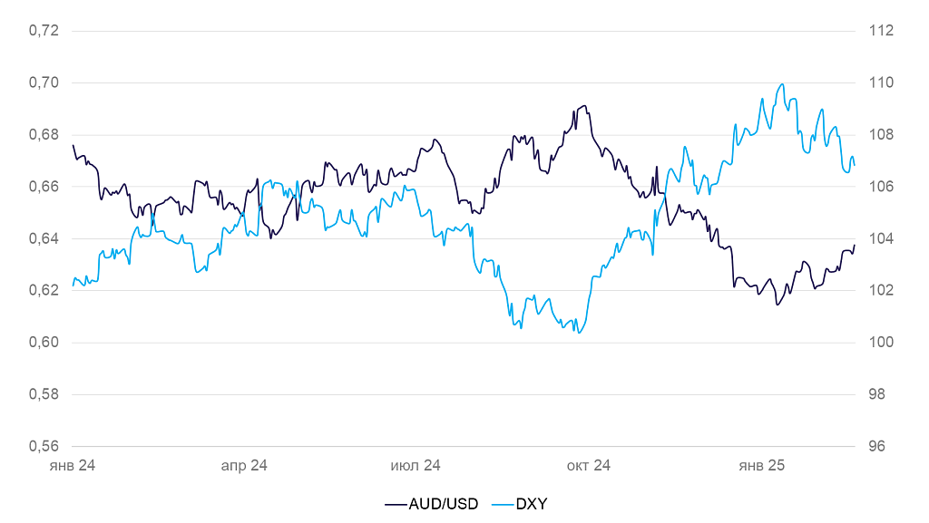 Динамика индекса доллара DXY и валютной пары AUD/USD