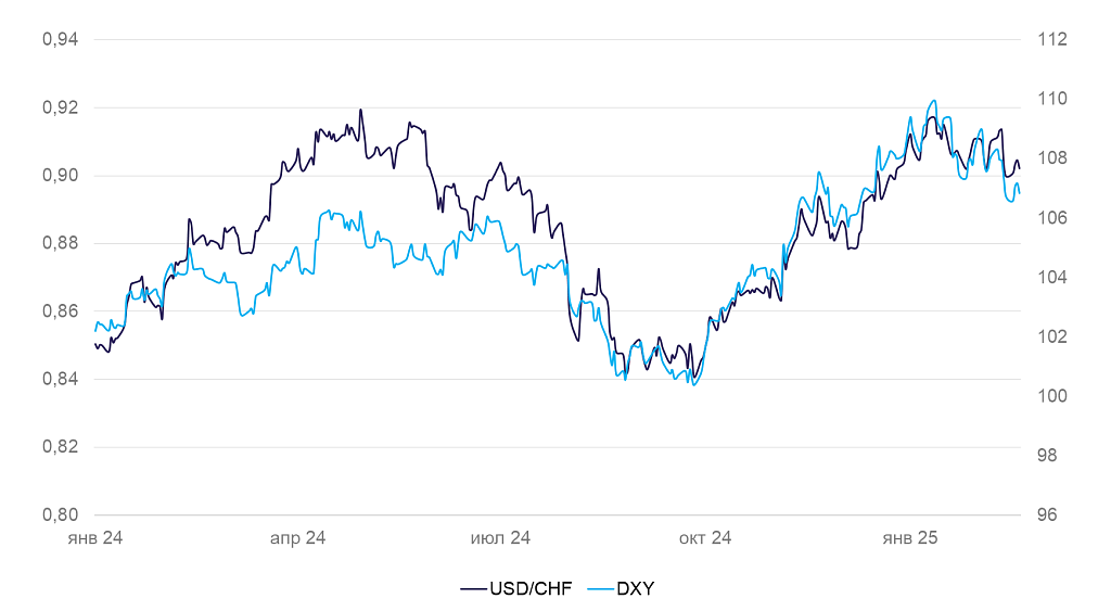 Динамика индекса доллара DXY и валютной пары USD/CHF